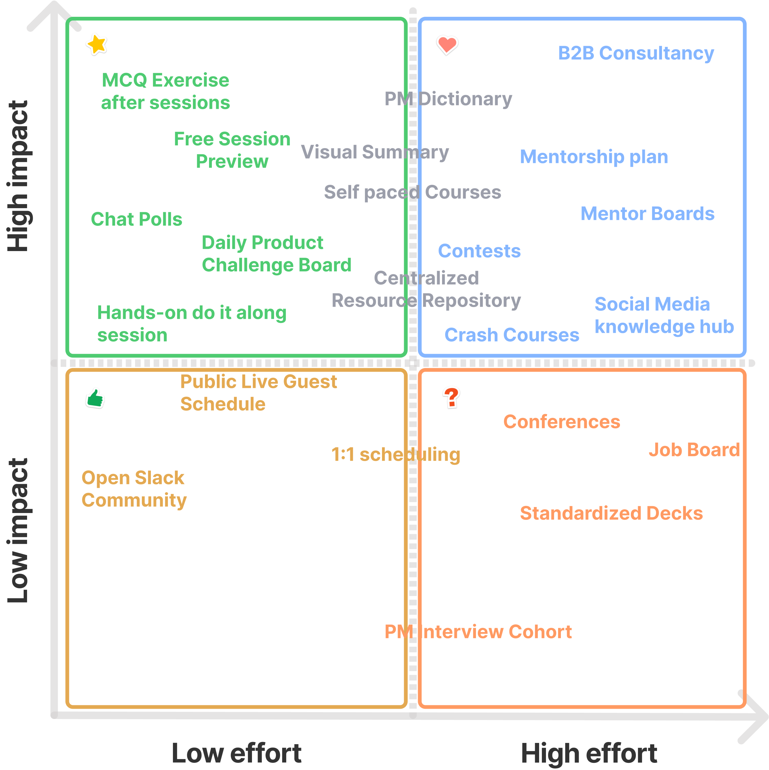 To better understand which should be the areas of focus in short, mid and long term, lets assess each ideas on two major factors impact and effort.
