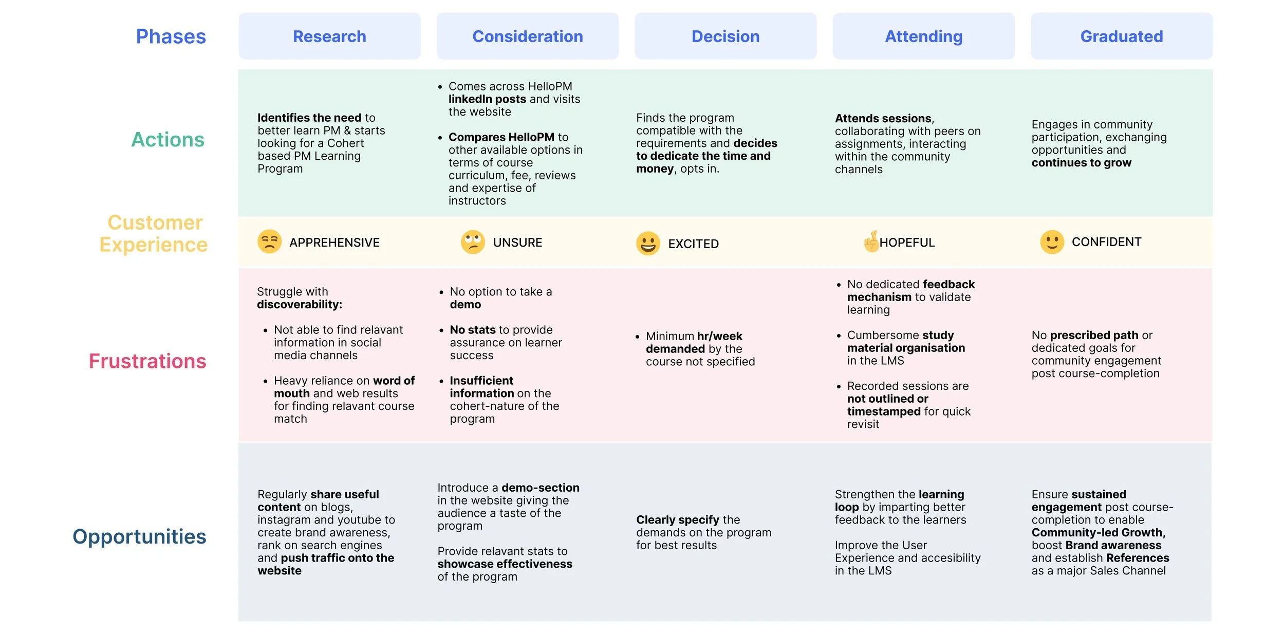 After understanding the core segments, conducting an extensive journey mapping workshop allowed further identifying the unveiling pain points associated at different stages in the user’s journey with Hello PM as well as potential areas of opportunities.